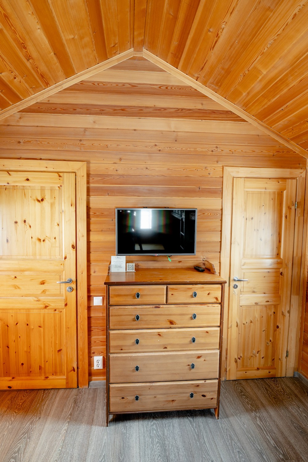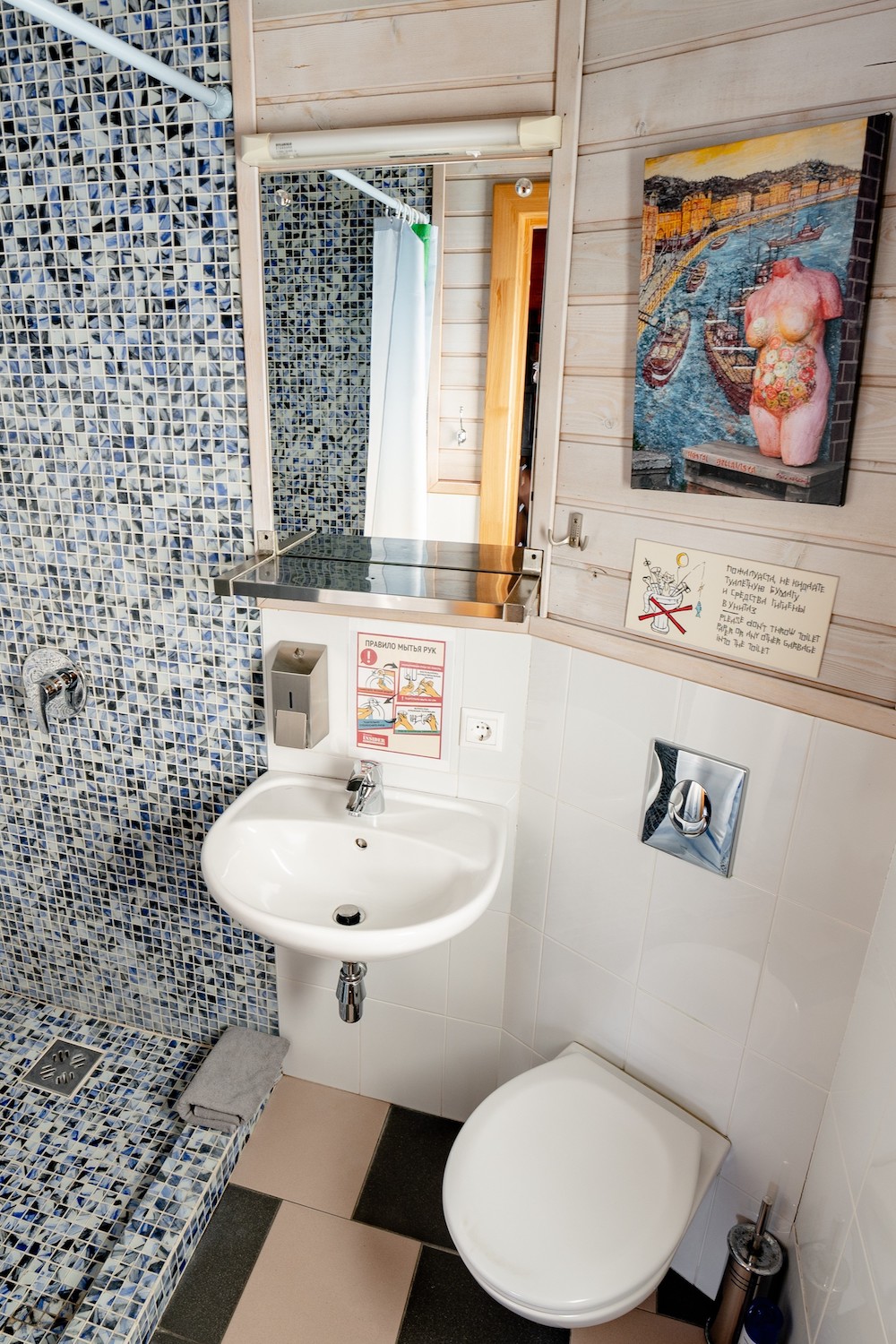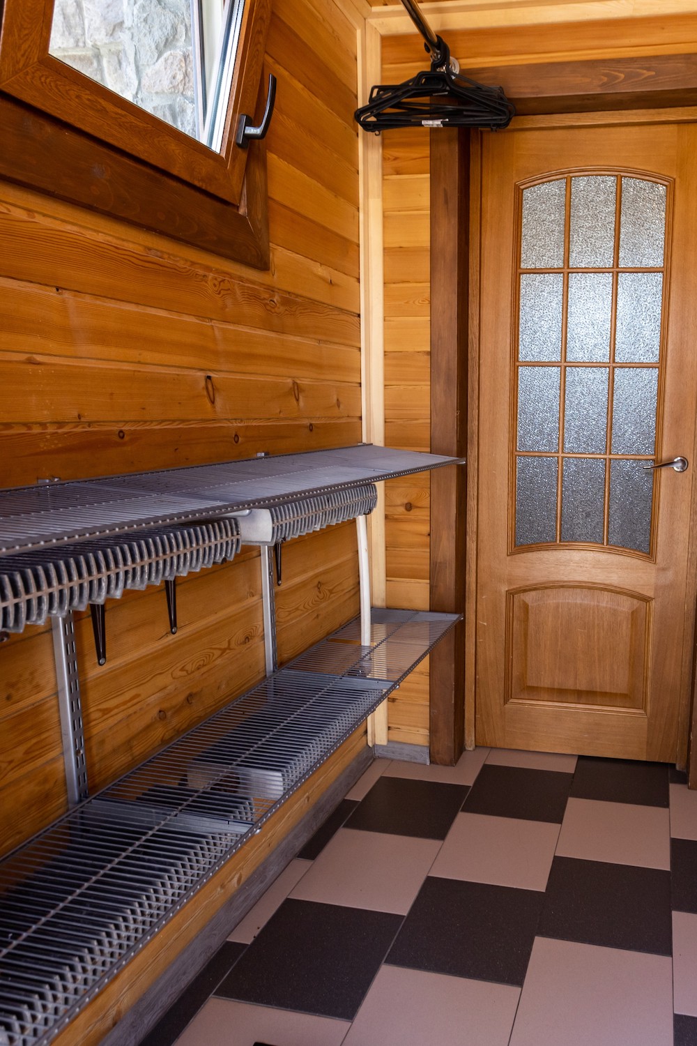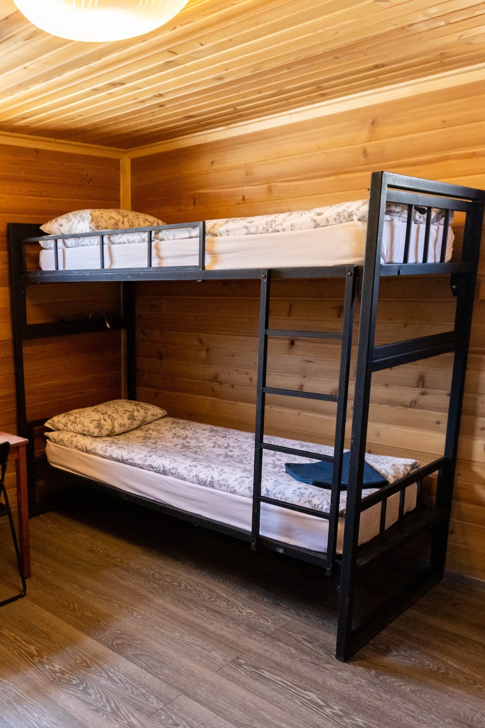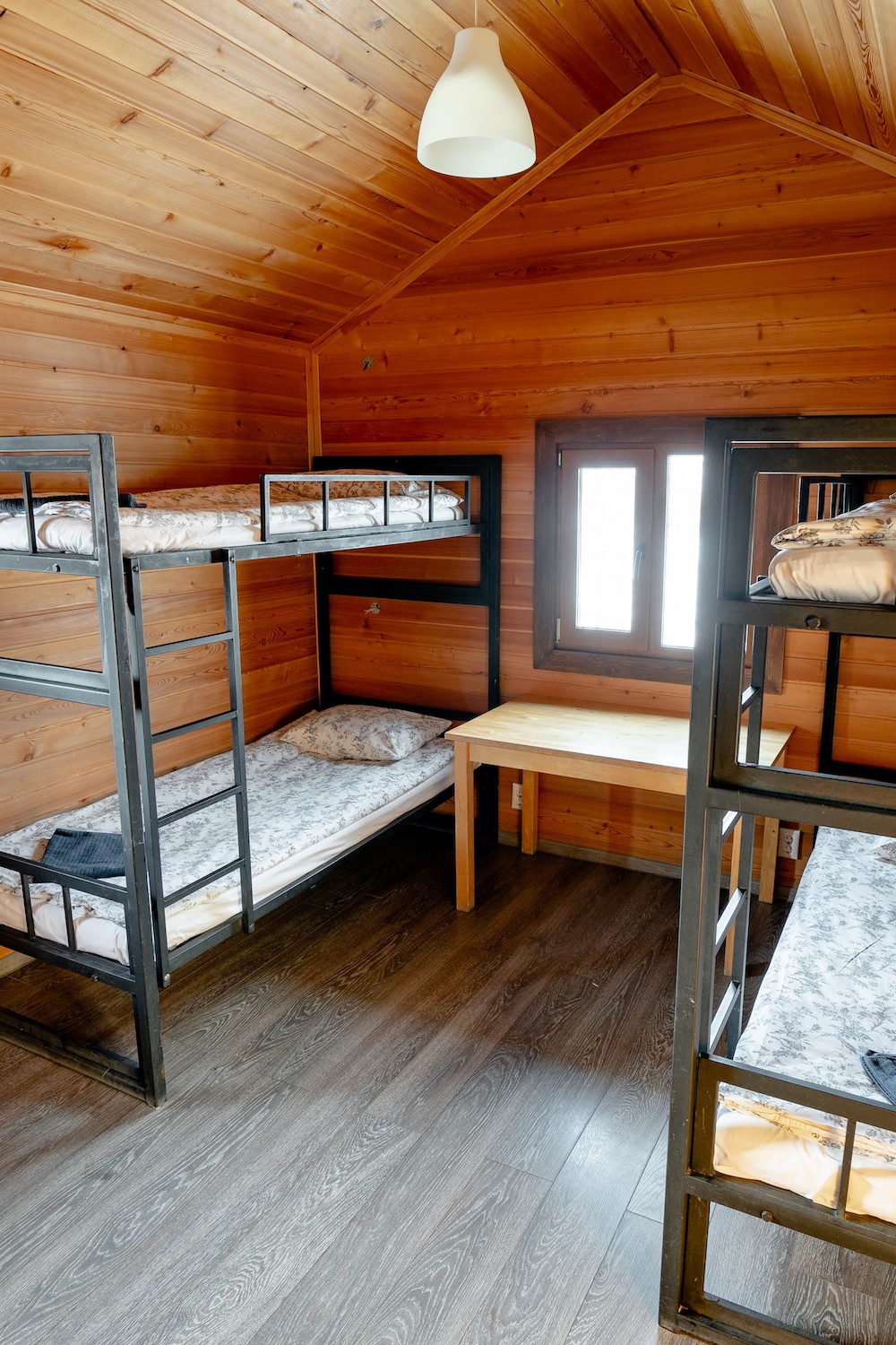 Номера оборудованы двухъярусными кроватями и индивидуальным санузлом. На первом этаже расположена сушильная комната. Максимальная вместимость домика 16 человек.