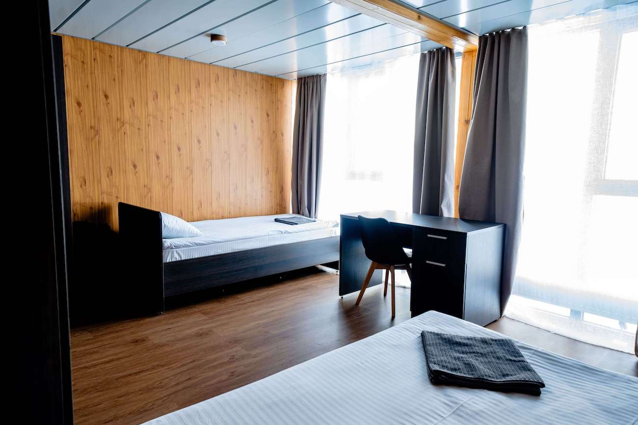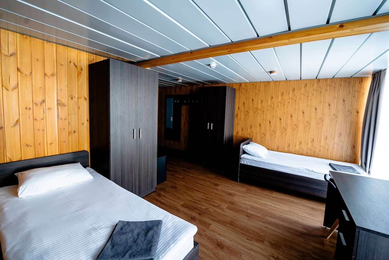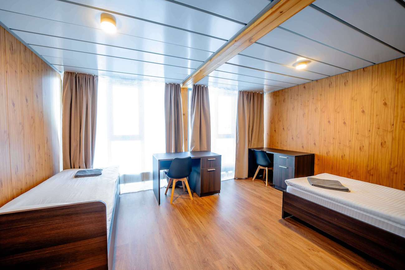Номер "Standart Twin"- это просторная теплая комната, общей площадью 25 кв.м. с двумя односпальными кроватями, личной зоной душевой/санузел и панорамными окнами.